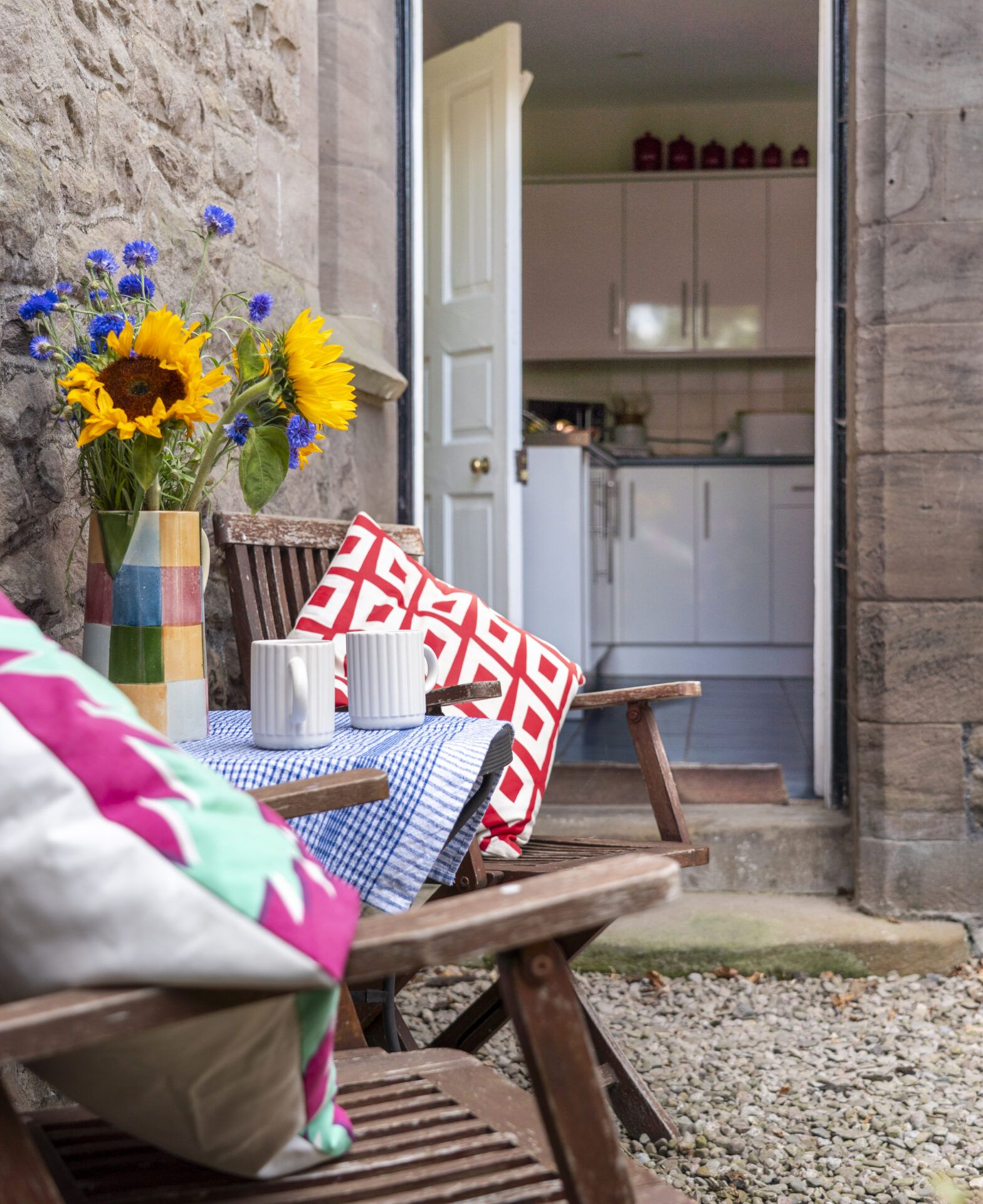 Accommodation at Gardeners Cottage is well laid out with eclectic decor and furniture. An enclosed courtyard leads to the rear entrance of the cottage which leads straight into the fitted kitchen, with a utility room and large shower/wetroom and toilet. The dining room will seat up to 8 around a large vintage table. The sitting room is the other side of the front entrance and porch area and has comfortable sofas, armchairs and a delightful wood-burner.
