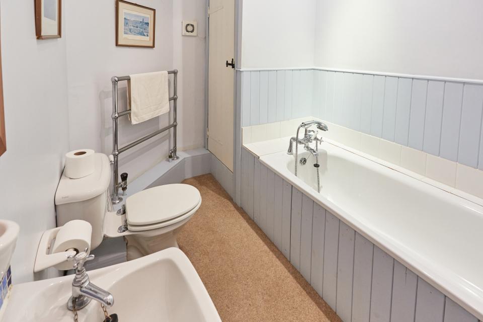 Upstairs, there are 3 bedrooms: Bedroom 1 with a kingsize bed and a vanity unit; Bedroom 2 with a kingsize bed and French style basin; Bedroom 3 with twin beds. The main family sized bathroom has a large enamel bath, basin and toilet.